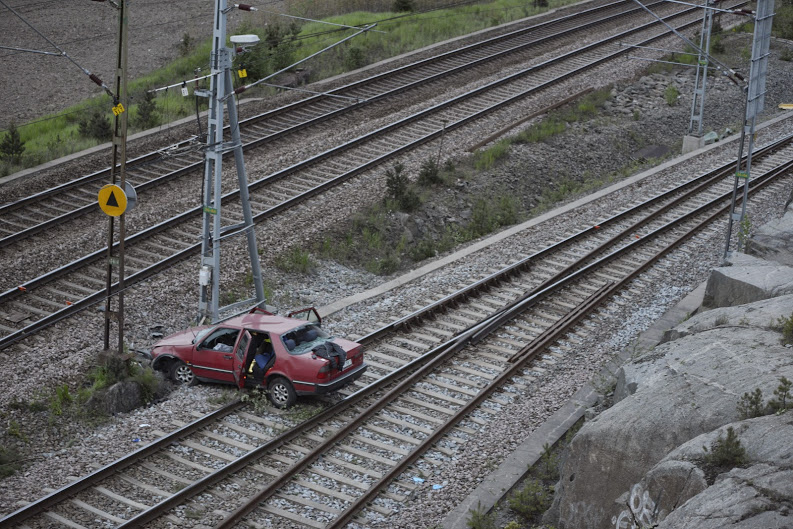 Blåljus En bil som hamnade på tågspåret vid Brista stoppade trafiken kring 21-tiden på söndagskvällen.
