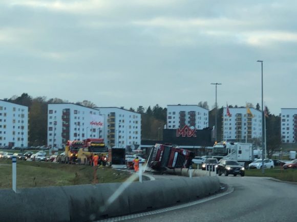 Blåljus Det är kraftiga framkomlighetsproblem i Märstarondellen efter att en lastbil vält under förmiddagen.