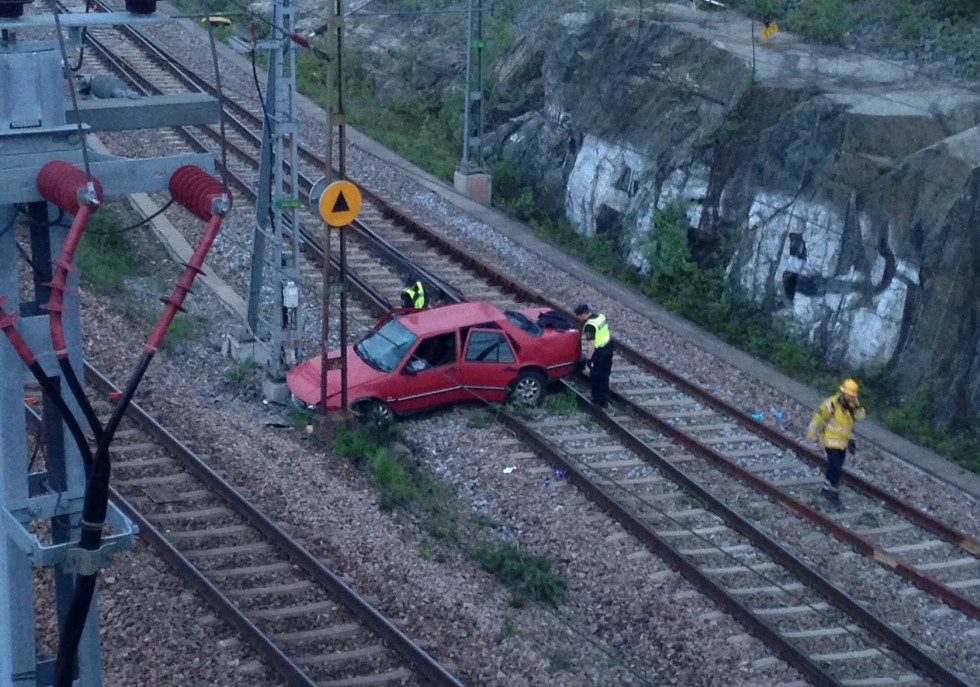 Räddningstjänst larmades till Brista kring 21 sedan förbipasserande sett en bil på spåren och en man utanför. Polis undersöker bilen i skrivande stund och tekniker är på plats för att säkra upp elledningar innan tågen kan börja åka igen. Omständigheterna kring hur bilen hamnade på spåret var oklara, det första gjorde gällande att den kört längs Norrsundavägen och sedan ner i diket och upp på rälsen, men senare ändrades uppgiften till att bilen kommit från Bristahållet, kommit ur vägen och kört över stupet ner på rälsen. Fallet ska ha varit cirka 10 meter ner. Föraren som var i 30-årsåldern fick föras till sjukhus med det är oklart om denne är misstänkt för brott.