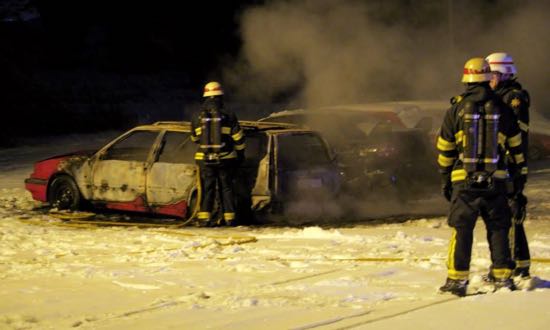 Larm om branden inkom vid 22.30-tiden och hela sju brandbilar åkte ut då det fanns många bilar parkerade på platsen likaså husvagnar med gasoltuber, när de första bilarna anländer kan dock faran skrivas ner lite och resterande brandbilar vände. Men branden hann inte sprida sig längre än till den bil som stod bredvid. Den aktuella bilen, en Volvo, totalförstördes.