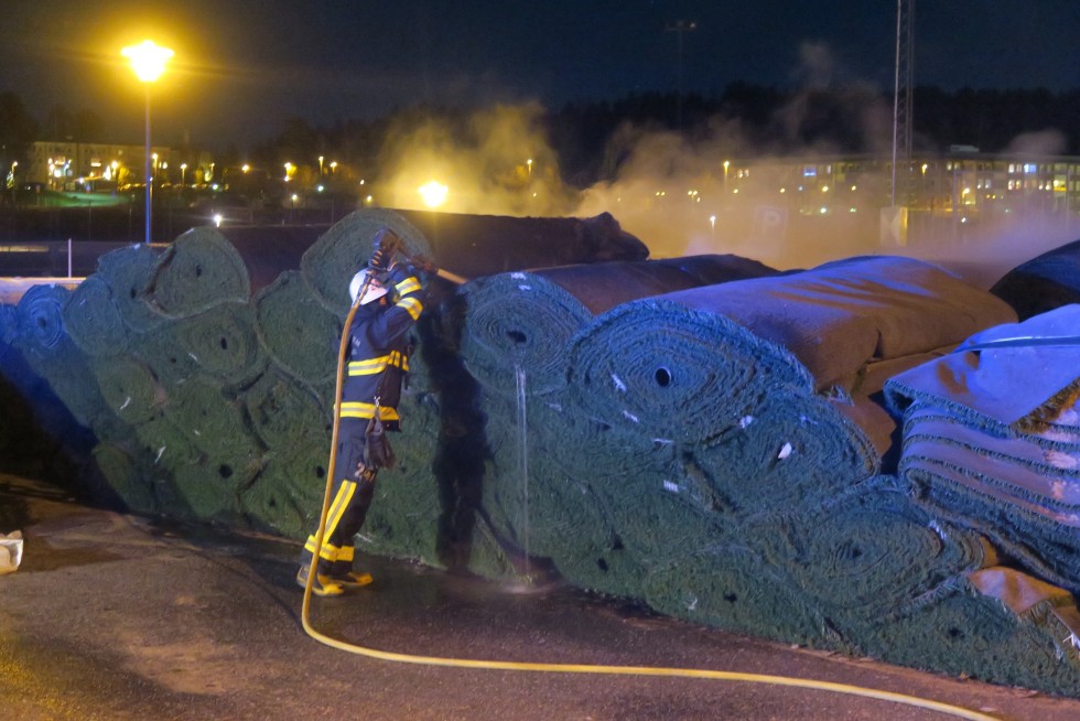 Vid midnatt kallades brandkår till Midgårdsvallen där någon tänt på de gamla rullarna från förra mattan: - Det är två rullar med konstgräs som har brunnit, säger Tomas Lundén, ledningsoperatör vid Storstockholms räddningscentral.