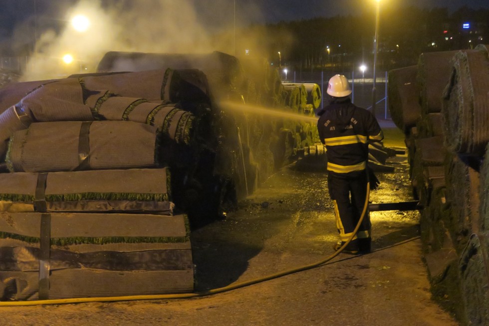 Någon hade tänt på konstgräsrullarna som legat vid Midgårdsvallens konstgräsplan sedan i somras. När gräset byttes ut så lades de gamla rullarna vid sidan om. Men vid midnatt var någon framme och tuttade eld. Tomas Lundén, räddningsoperatör vid Storstockholms brandförsvar säger att det inte förelåg spridningsrisk. Två av rullarna brann: – Någon tyckte väl det var kul att tända på, säger Lundén.