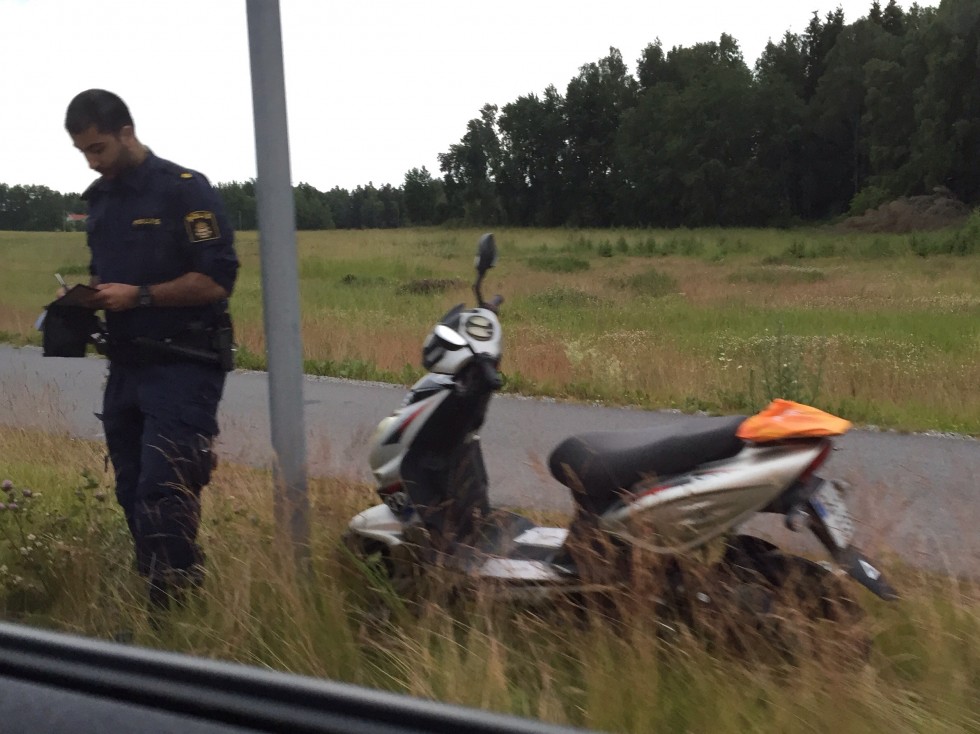 Mopeden körde av okänd anledning ner i diket och polis samt ambulans tillkallades. Framkomligheten begränsades något förbi olycksplatsen. Mopedföraren fördes till sjukhus med oklara skador enligt Räddningscentralen i Stockholms län.