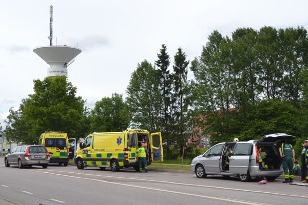 Två bilar var inblandade i olyckan som inträffade i korsningen Bristagatan/Servogatan vid OK/Q8. Brandkår, ambulans och polis tillkallades. Flera personer fick vård på plats, enligt Polisens regionledningscentral är två personer förda till sjukhus med befarade ryggskador. Olyckan ska nu utredas men det finns ingen misstanke om att påverkade förare.
