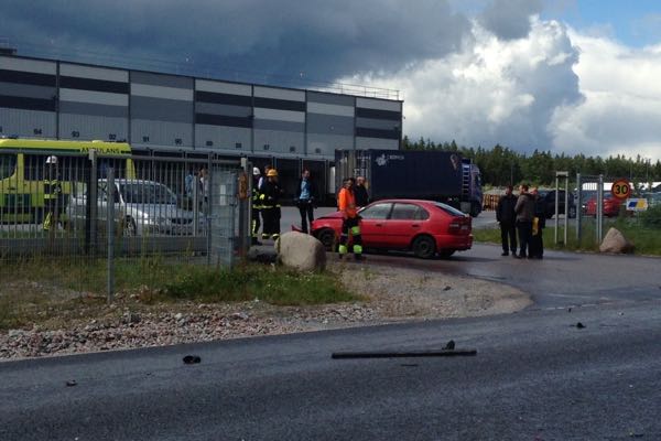 Olyckan inträffade vid 13.15-tiden i en utfart från en fastighet på Metallvägen i Rosersbergs arbetsplatsområde. Sopbilen från IL Recycling tog den största delen av smällen och hade en demolerad front samt hamnade nästan nere i diket. Två andra personbilar stod vid utfarten till Metallvägen. Det låg mycket bråte och metalldelar kvar i vägbanan som brandkår skyfflade undan. Två personer, en förare och en passagerare fördes till sjukhus med oklara skador. Polisen har upprättat en trafikmålsanteckning och utreder även olovlig körning. Hur olyckan gått till är inte klarlagt just nu.