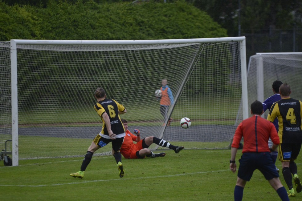 32. Leven får bollen till vänster om målvakten och drar till på halvvolley. Matchens bästa chans. Men EIS målvakt räddar.