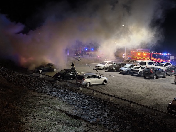 Larmet gällde initialt en personbil, men när räddningstjänsten kom fram visade det sig att två fordon stod i lågor. Branden kunde släckas innan den spred sig vidare. Båda bilarna blev helt utbrända. Ingen person ska ha skadats. Polisen tog över ärendet och upprättade en anmälan om skadegörelse genom brand.
