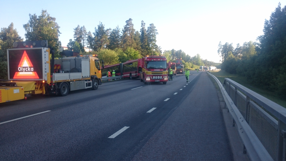 En buss utan passagerare ska av okänd anledning kört av vägen strax efter bron i riktning mot Märsta. Framkomligheten är begränsad förbi platsen. Chauffören uppges vara chockad men inte fysiskt skadad.