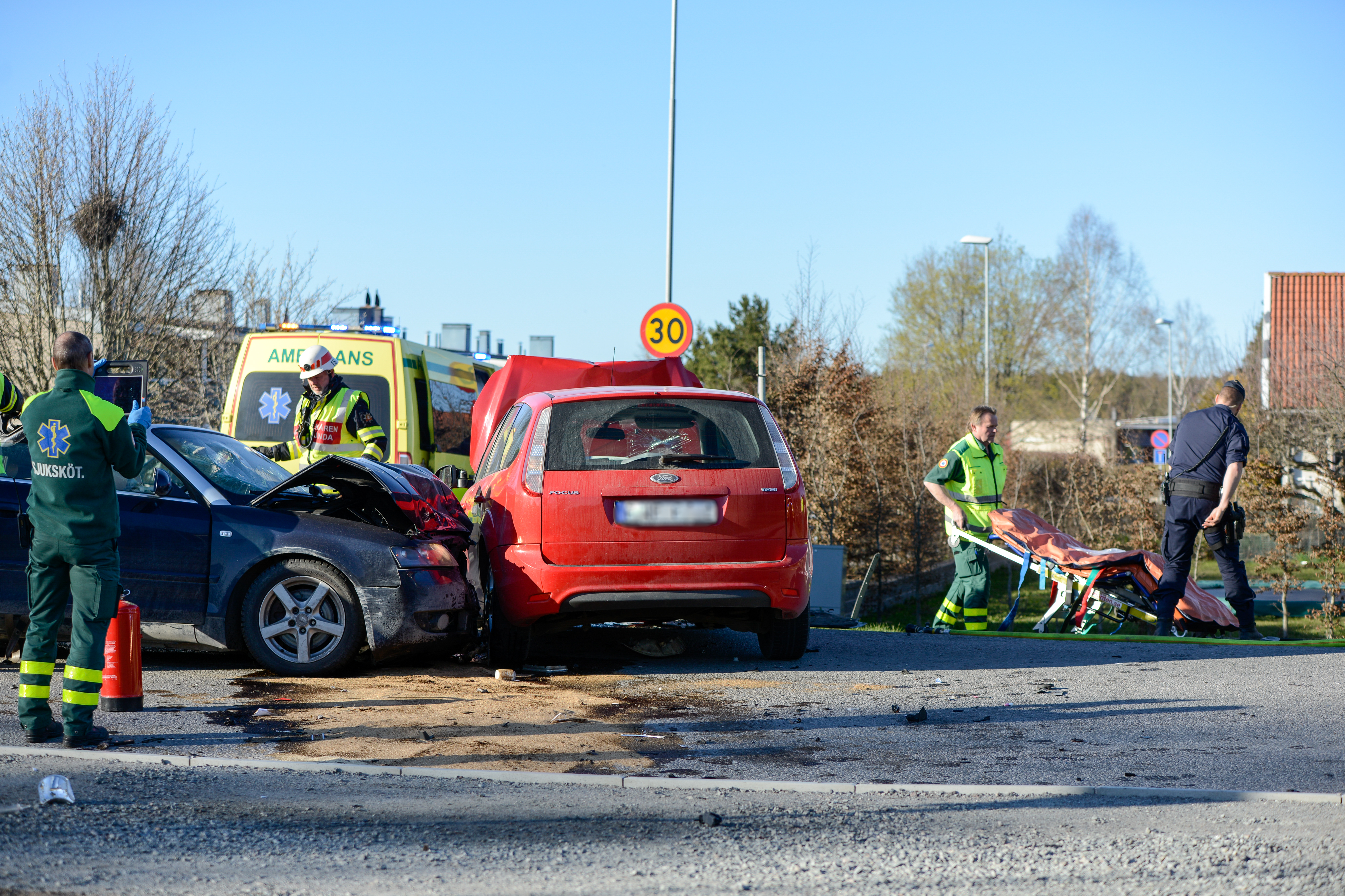 Vansinnesfärden tog slut på Fasadvägen där föraren frontalkrockade med en personbil. I den bilen satt två personer som fick transporteras till sjukhus med ambulans och ambulanshelikopter. Enligt SOS Alarm tappade en av de inblandade medvetandet och skadades allvarligt. Ett ögonvittne berättar för märsta.nu att den misstänkta rattfylleristen körde över 120 km/h vid krocken.