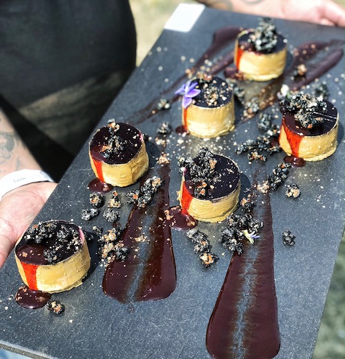 – Bogen kördes över natten ca 10 timmar, sen körde vi pulled pork, poppade svålen och serverade som krisp. Vegetarisk blev det en burgare med zucchini, bulgur, svart vitlök, rökt cheddar och gruyere bland annat. Fisken rimmade vi över natten och helgrillade, rubbade med en mix av ghee, svart vitlök, en het sås, citron och serverade med trippelfriterade strips på grillen, picklad polkabeta och ramslöksmajonäs, berättar Robin.