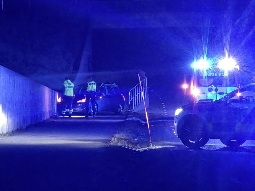 Det er strax efter klockan 1 natten mot fredag som en bil av okänd anledning körde av vägen och in i på gång- och cykelvägen innan det tog stopp när bilen stötte emot tunnelfundamentet. Polis och ambulans tillkallades. Skadeläget är i nuläget okänt.